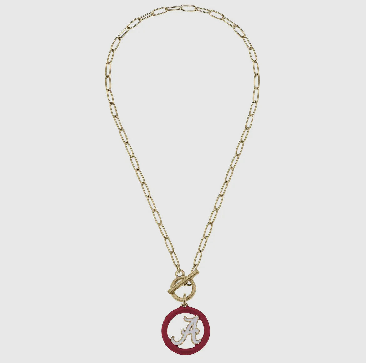 This necklace features the renowned Alabama Crimson Tide logo, crafted with enamel coating and a T-bar design. Show off your team pride and elevate your outfit with this sleek and stylish accessory. Perfect for game days or everyday wear. Go Tide!