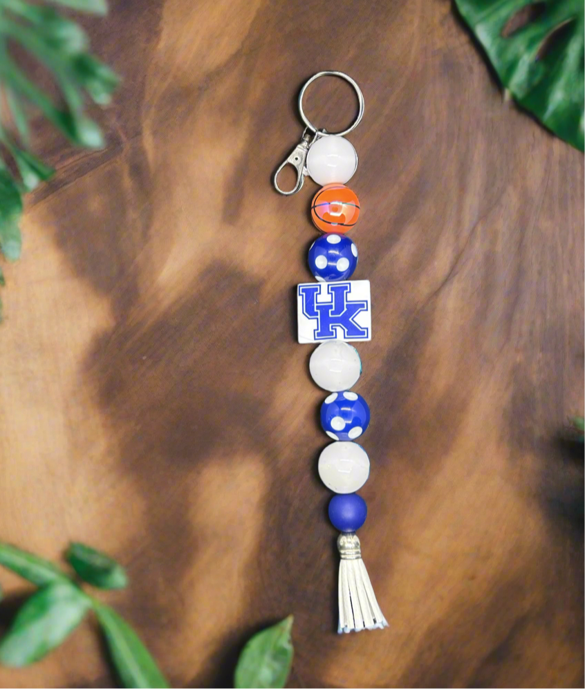 "Represent your favorite team with the UK University of Kentucky Wildcats Basketball Bubblegum Beaded Keychain. This unique and colorful accessory is perfect for showing off your team spirit. Its sturdy design ensures it will securely hold your keys, making it both fashionable and functional."