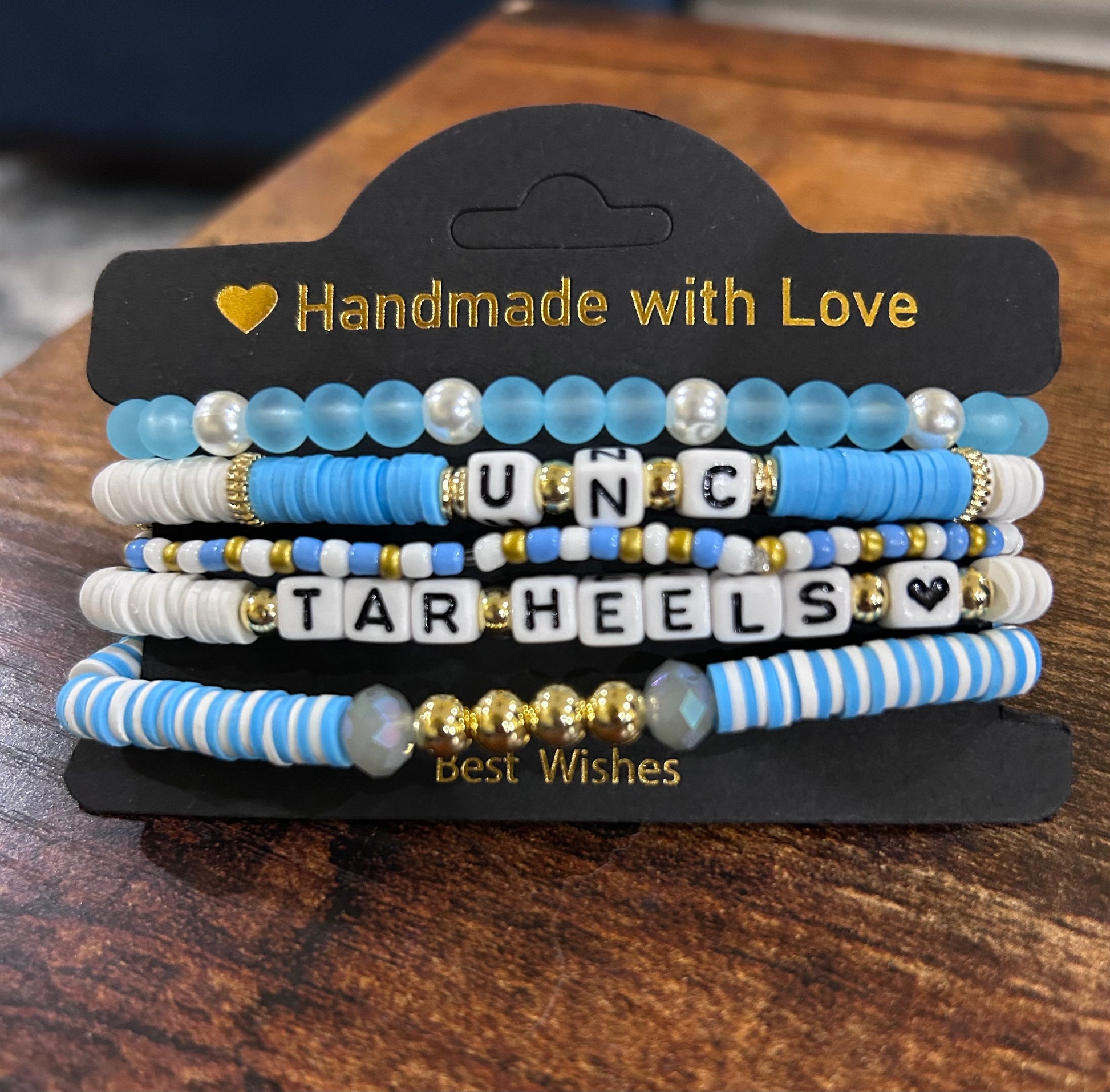 Assembled by hand, the UNC Tar Heels Bracelet Stack is made of quality materials to ensure durability. Showcasing your pride and loyalty for the team, this stack is perfect for game day or everyday wear. With the stack, you can support your team in style and elevate your game day look.